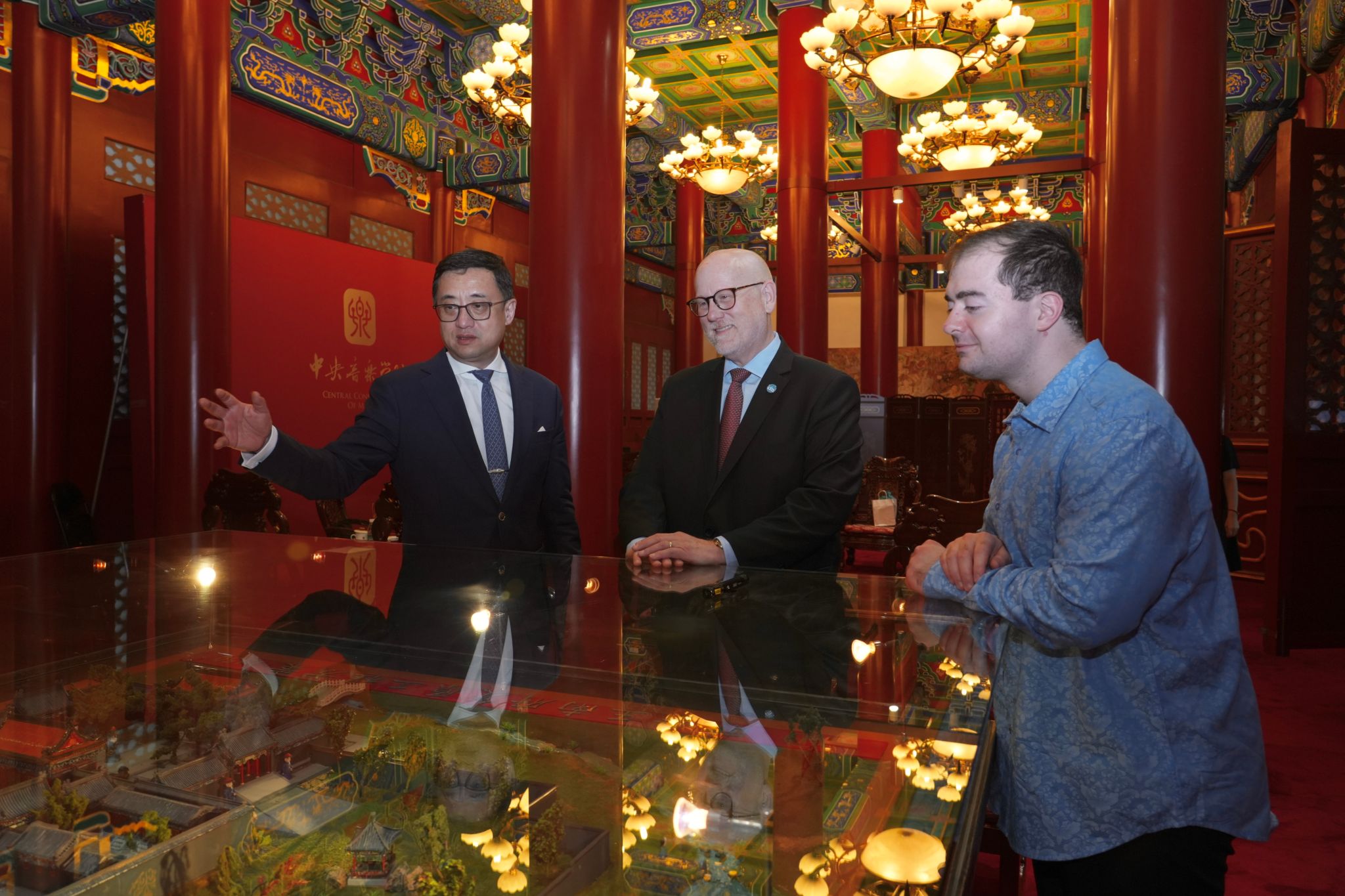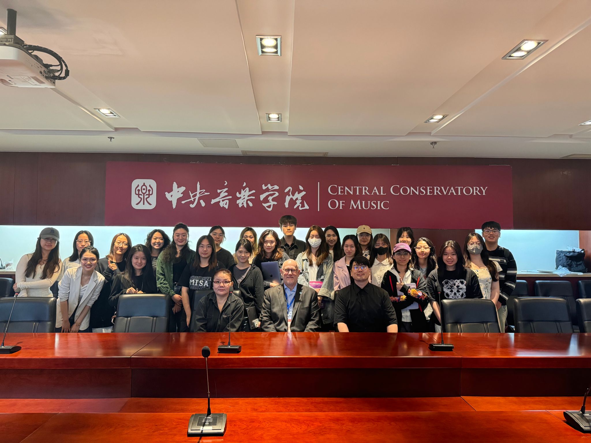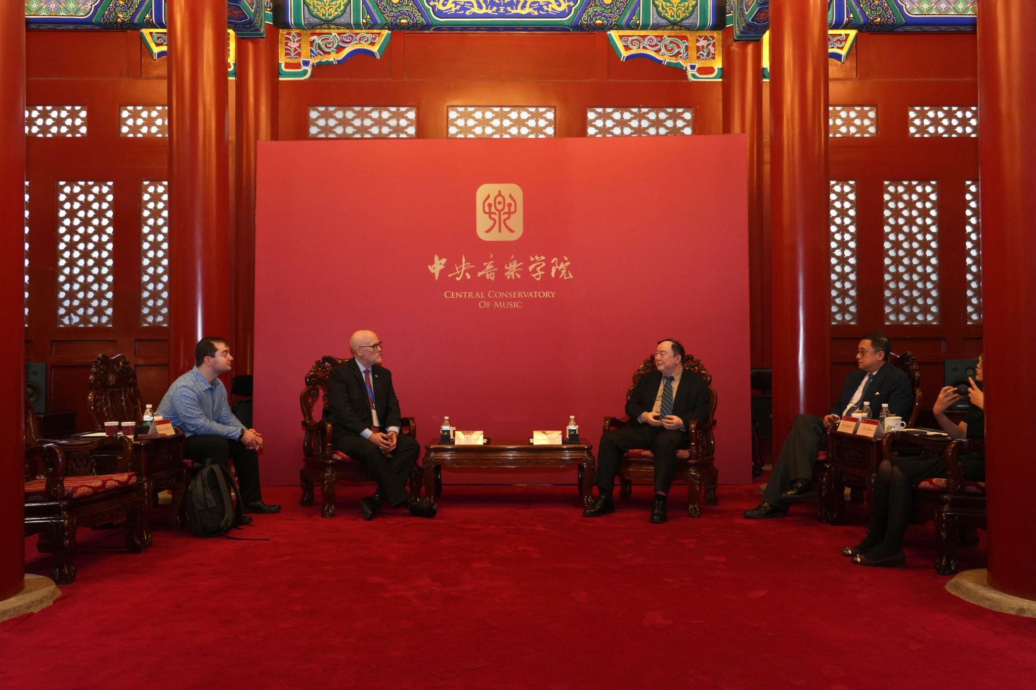 2025年5月21日,美国克利夫兰音乐学院院长保罗·霍格尔教授(Paul W. Hogle)和大提琴家丹尼尔·卡勒先生(Daniel Kaler)来到我校参观访问。俞峰校长在南大殿与其进行了亲切的会谈。我校钢琴系主任韦丹文教授、国际交流处处长陶倩陪同会谈。