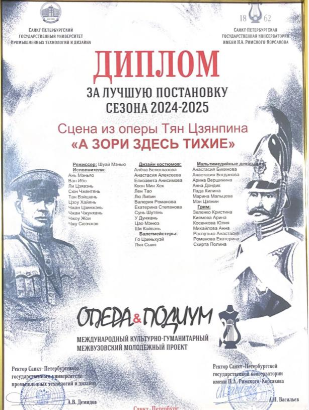 特殊时刻致敬历史记忆。艺术凝聚和平共识,今年适逢世界反法西斯战争胜利80周年,唐建平教授的受邀不仅是对其个人艺术成就的认可,更彰显了中俄两国以文化艺术共筑历史记忆的深远意义。在“歌剧与舞台”歌剧演出项目中,评委会一致通过将特等奖颁给《这里的黎明静悄悄》。唐教授通过青年艺术人才培养、歌剧创作研讨及跨文化对话等活动,在圣彼得堡里姆斯基科萨科夫音乐学院获邀举办了作曲大师讲座,分享了中国歌剧创作经验,还与前来的作曲教授和学生们分享讨论了音乐创作经验。