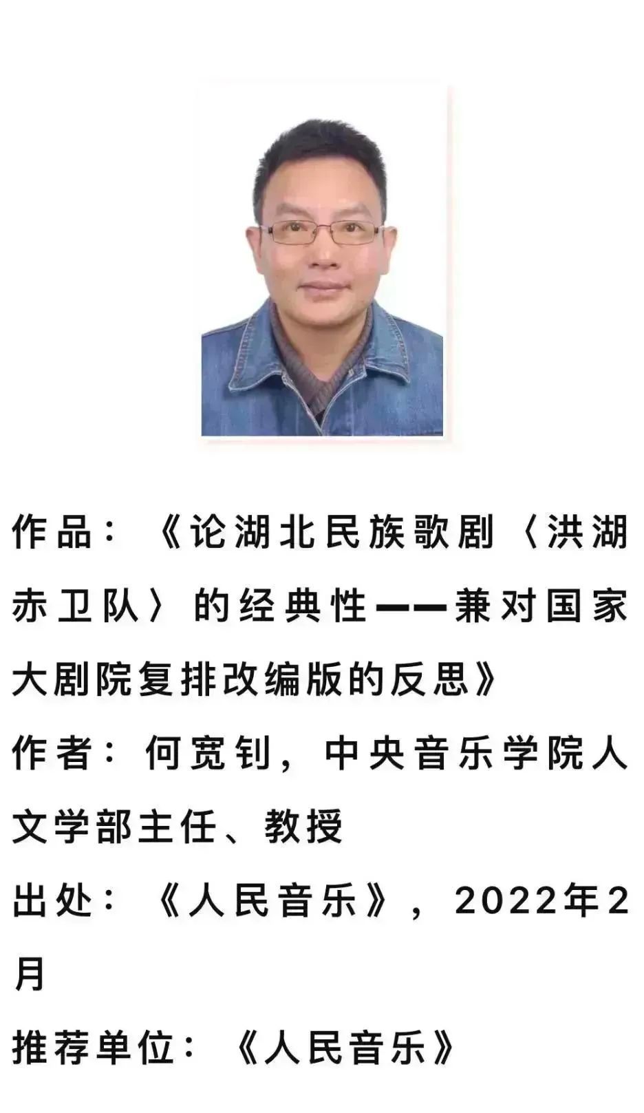 我校音乐学系何宽钊教授的《论湖北民族歌剧<洪湖赤卫队>的经典性——兼对国家大剧院复排改编版的反思》一文荣获年度优秀作品,其本人被授予“啄木鸟”杯。